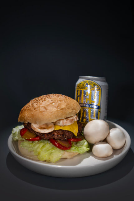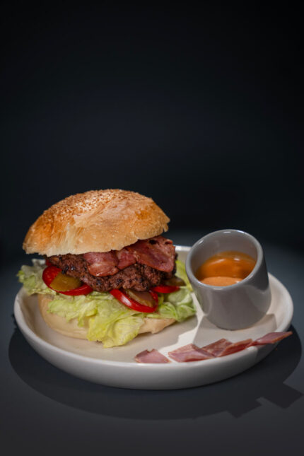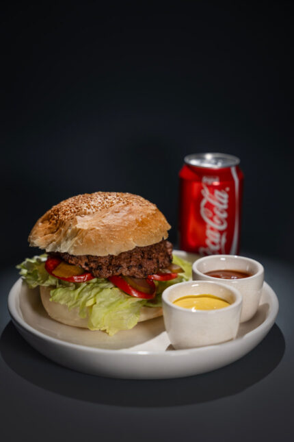 ۱۳۰ گرم گوشت چرخ شده مزه دار شده + کاهو + گوجه + خیارشور